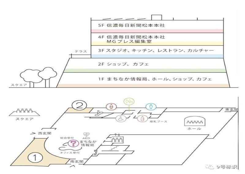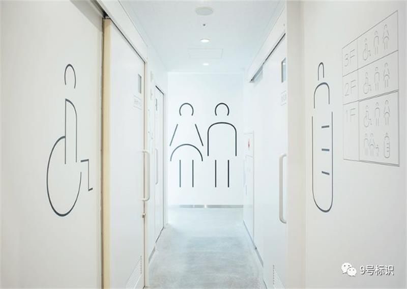 设计从报纸中汲取灵感,设计了具有板式元素的logo,体现了该公司的特征。针对多种用途的复合设施,设计了一套以细线为元素的字体和icon,采用黑白配色,使得整体环境效果清晰干净。Icon的设计比较新颖,由非闭合线条构成,具有流通感。在平面图中增加了楼层卫生间的整合,并展现在每层的卫生间区域,便于信息传达更全面。