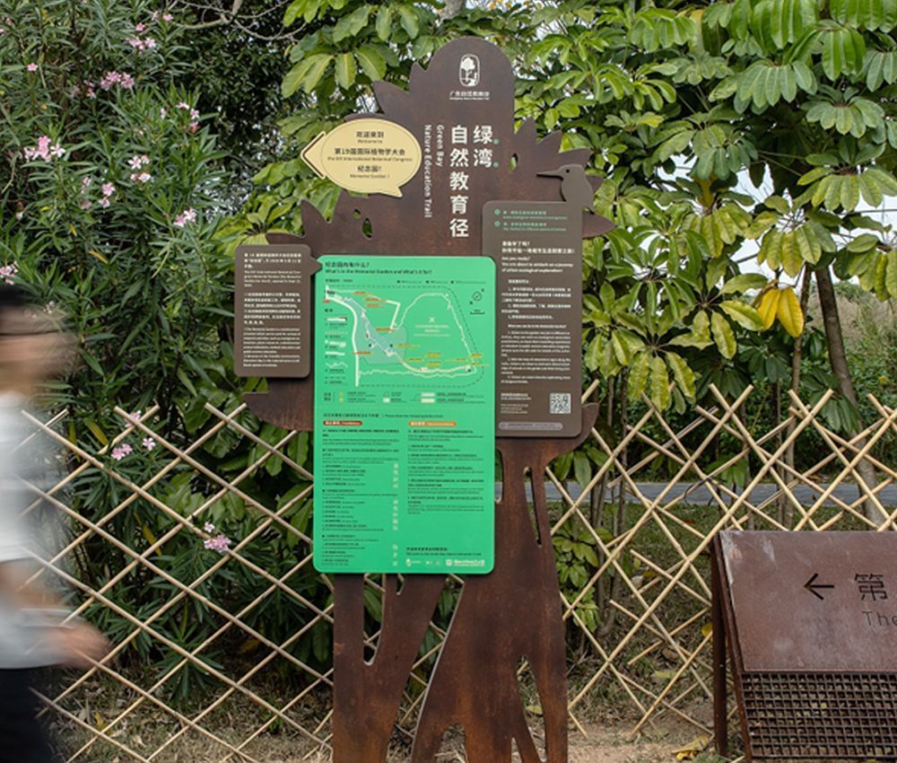 绿湾自然研学基地是开启公众亲近湿地、了解和学习环境保护之门。将湿地知识融入到游览与体验之中,园区科普导览系统分为“生态修复”和“生态探索”两大板块:16个主题、19组导视牌坐落位于全程700米的自然步道上。人们在领略自然风光的同时,通过导视牌了解湿地保护的进程、结识与观察未知的物种和互动探索红树林的秘密。