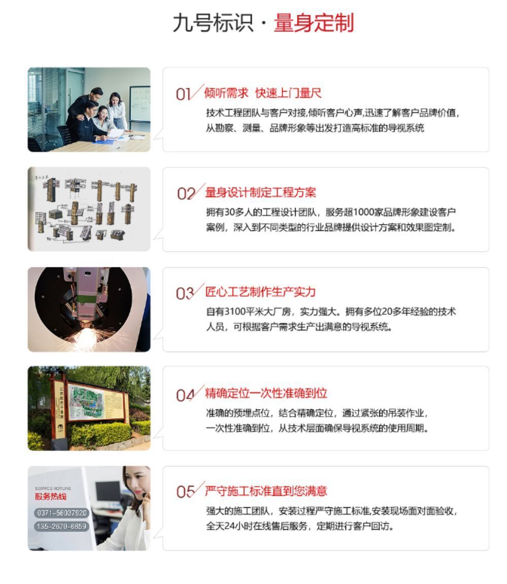 标识标牌是融合规划、建筑、空间、雕塑、逻辑、色彩、美学、材质组合于-体的产物。它既不是简单的文字,更不是所谓的牌子,它是与环境相融的艺术作品! 9号标识从考察调研到规划设计,从生产制作到安装维护,我们从不墨守成规,而是不断创造新的行业规范, 确保每一个项目从始至终走过一 段高标准的历程。