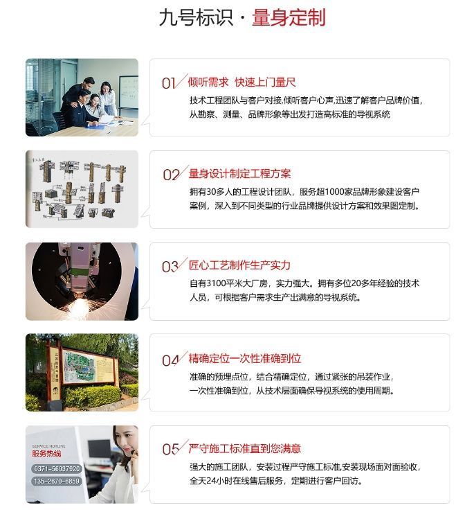 标识标牌是融合规划、建筑、空间、雕塑、逻辑、色、美学、材质组合于-体的产物。它既不是简单的文字,更不是所谓的牌子,它是与环境相融的艺术作品!9号标识从考察调研到规划设计,从生产制作到安装维护,我们从不墨守成规,而是不断创造新的行业规范,确保每个项目从始至终走过 段高标准的历程。