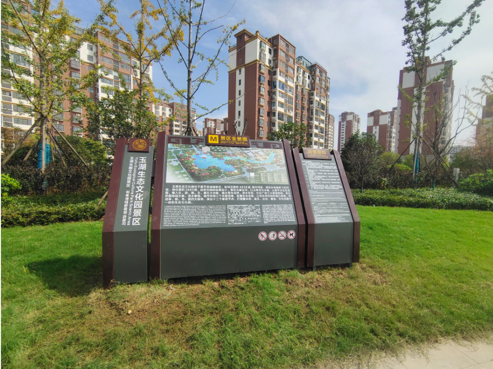 精确调整每块标识的安装角度与高度,确保在不同的光线条件、不同的游览场景下都能清晰展示信息,与玉湖的碧水、青山、林带、建筑完美相融。无论是矗立在景区入口的大型全景导览标识,还是安置在环湖步道、林区节点的小型介绍标识,都像是自然生长在这片土地上,与玉湖生态文化园的湖光山色、草木人文和谐共生,成为景区中道靓丽的文旅风景线。